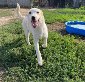Mit ihrem strahlenden Lächeln, dem seidigen cremeweißen Fell und den charmanten Karamell-Flecken im Gesicht ist Babs der Inbegriff guter Laune auf vier Pfoten.